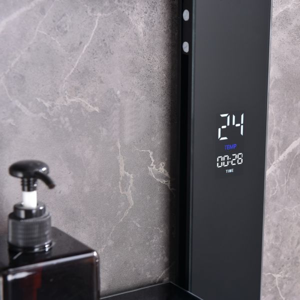 Особо стоит отметить держатель ручного душа с LED-дисплеем 70x24x1140 мм для контроля температуры воды прямо во время принятия душа. В комплекте также идут две полочки 237×105 мм для хранения ванных принадлежностей.