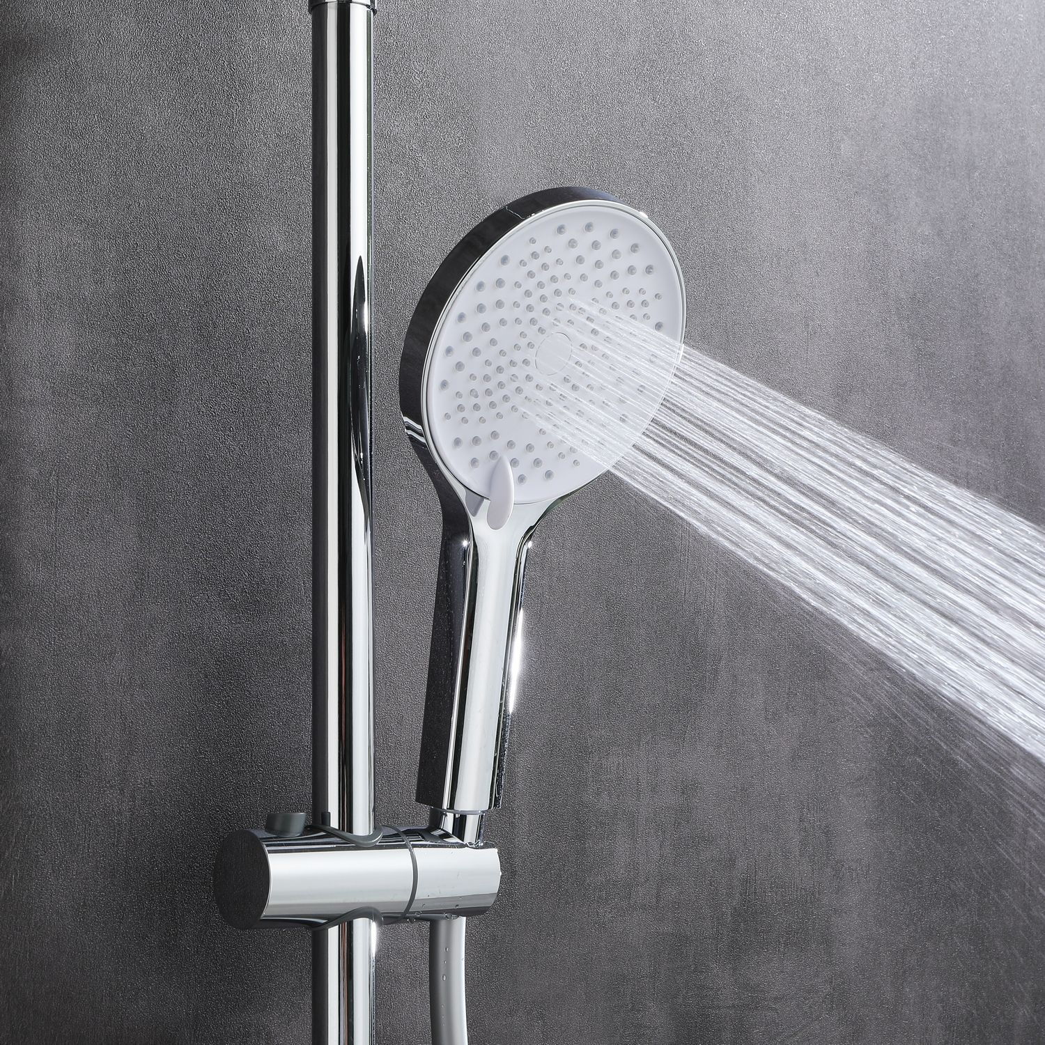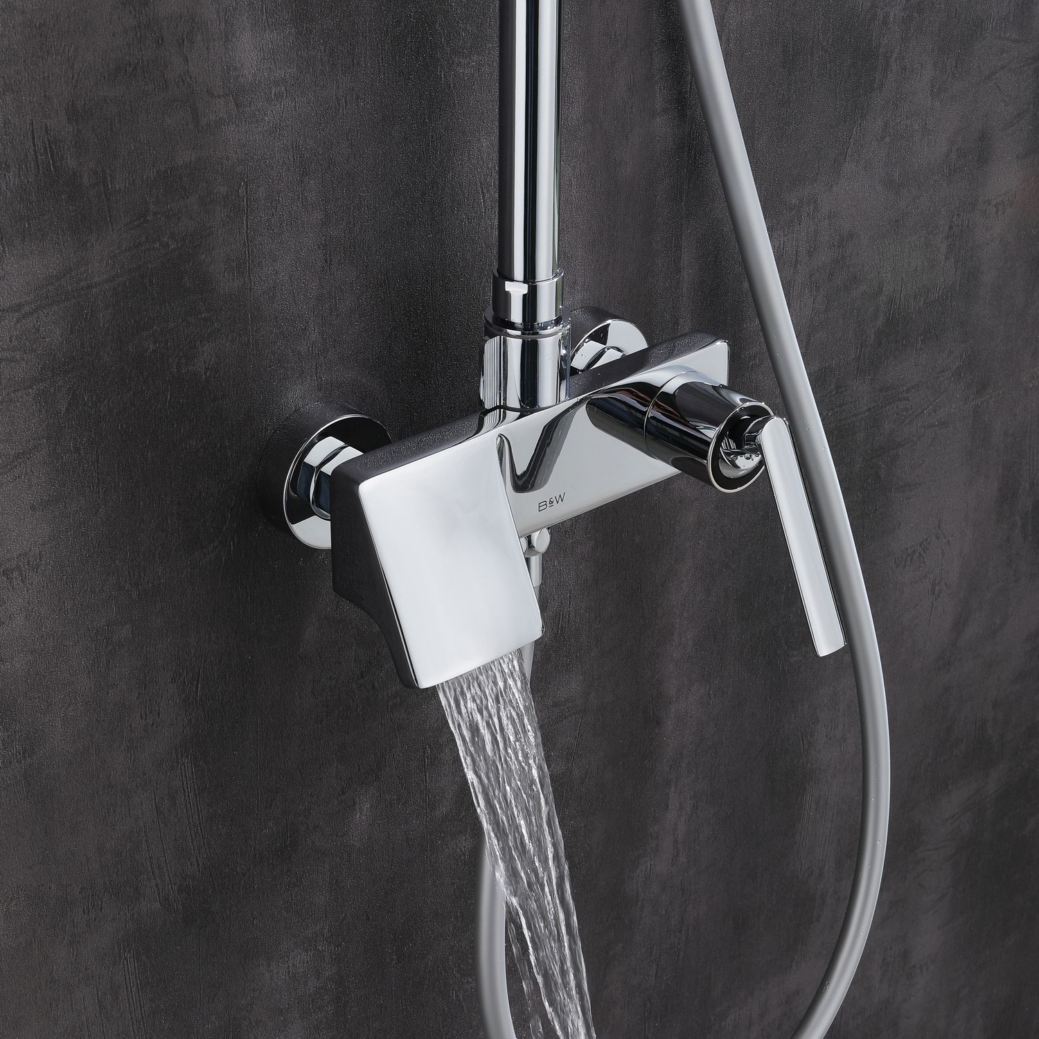 Душевая стойка в цвете глянцевый хром датского производителя Black&White. Корпус изделия произведен из сантехнической латуни – безопасного и коррозиестойкого сплава.Управление потоками и температурой воды выполняет керамический картридж повышенной пропускной способности.  Из потребителей на комплекте установлен верхний душ, ручной душ, а также на верхней части корпуса под углом расположен каскадный излив для набора емкостей. Для выбора режима работы  у основания стойки расположен поворотный дивертор выполненный в виде кольца с дополнительным выступом для удобства использования мокрыми руками.