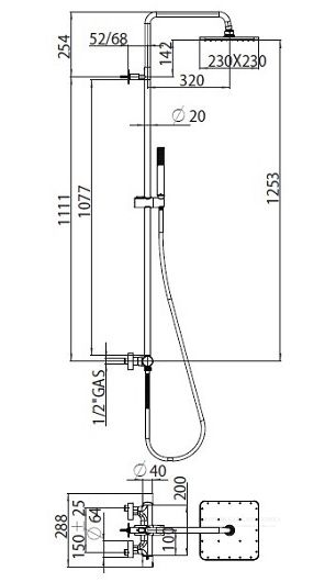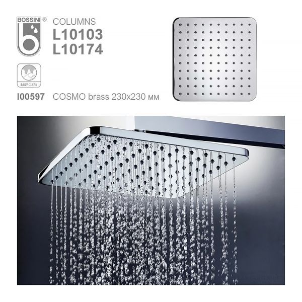 Душевая система Bossini – воплощение современного дизайна и технологического совершенства, созданное для тех, кто ценит современные тренды и высокое качество. Латунная стойка диаметром 20 мм гарантирует прочность и долгий срок службы, а верхний душ из коллекции Cosmo размером 230x230 мм обеспечивает мощный и равномерный поток воды, создавая ощущение комфорта и расслабления.