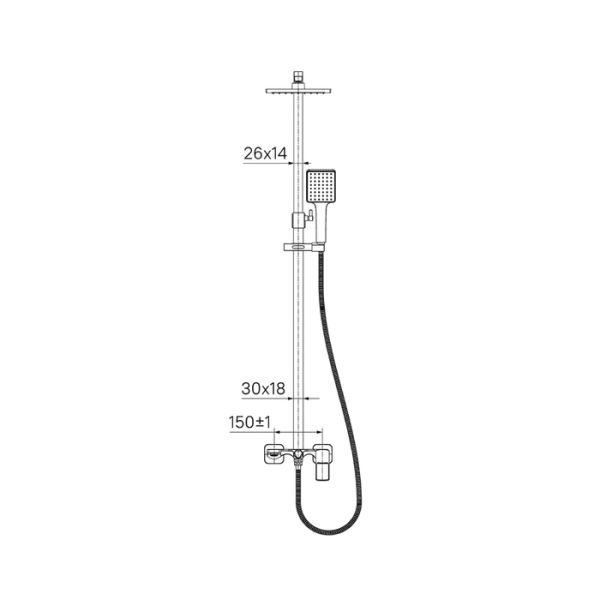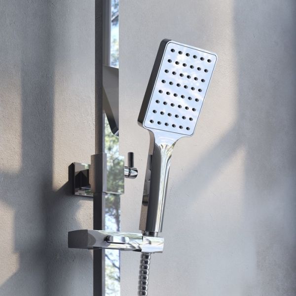 Смеситель для ванны Bild с верхним душем отличают выраженные геометрические формы и уникальный дизайн ручки-петли с тонкой изящной рамкой. Толщина рамки составляет всего 2 мм, при этом прочность ручки не снижается — она прослужит долгие годы. Излив эстетично интегрирован в корпус, вода из него поступает в ванну под комфортным углом. Стойка удобно регулируется по высоте.