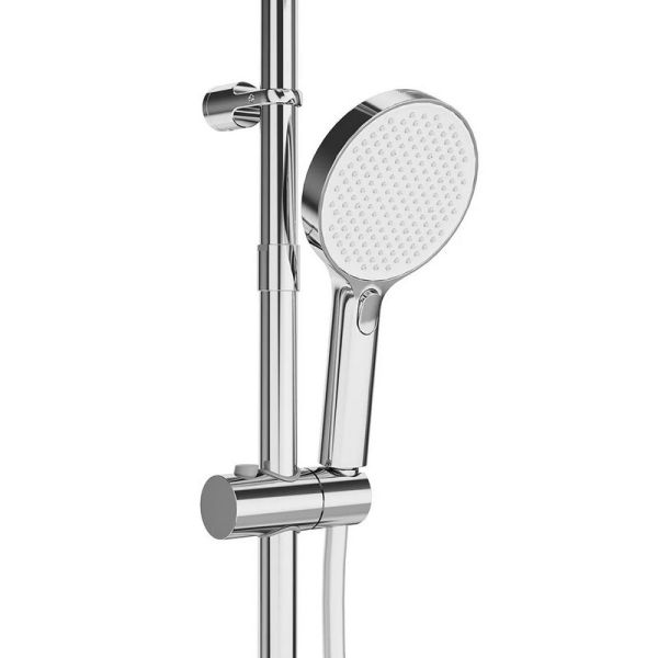 Верхний душ и ручная лейка имеют форму круга. Стойка выполнена из нержавеющей стали, круглая в сечении. У ручной лейки предусмотрены четыре режима потока. Регулировка высоты при установке — 1180-1750 мм.