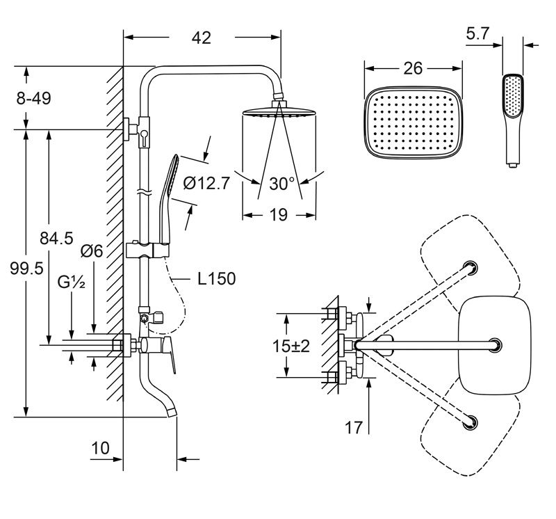 Комплектация - ручной душ, излив для набора воды, верхний душ