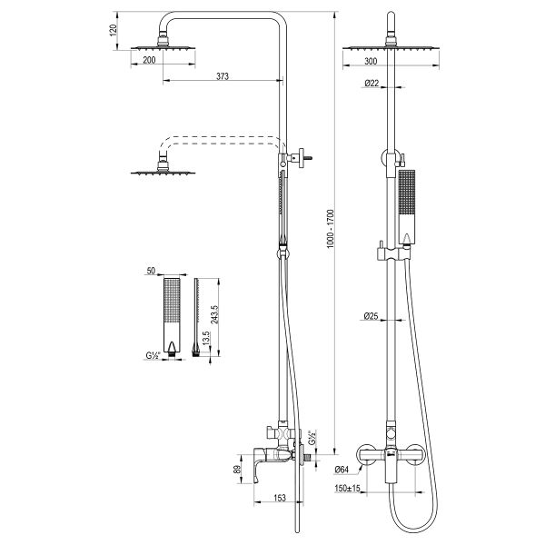 • Аксессуары в комплекте (верхняя душевая лейка «Тропический дождь 200x300 мм,1-функциональная лейка 68x272 мм, регулируемое по высоте крепление для лейки, душевой шланг 1,5 м)