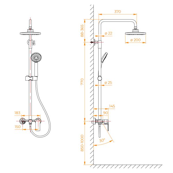 • Головной душ из высокопрочного ABS-пластика оснащён со шарнирным креплением, что позволяет выбрать необходимый угол направления воды;