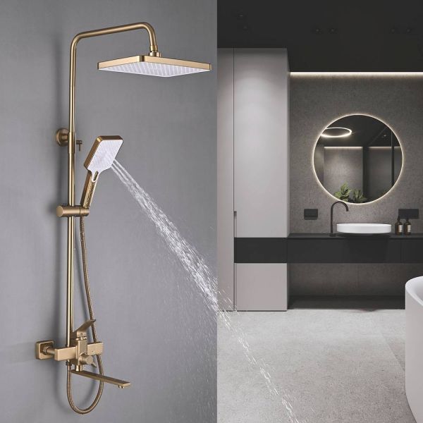 Душевая система Shevanik S6136G в цвете "золотой сатин" - идеальное решение для вашей ванной комнаты. Изготовленная из прочной латуни, она гарантирует долговечность и надежность использования.