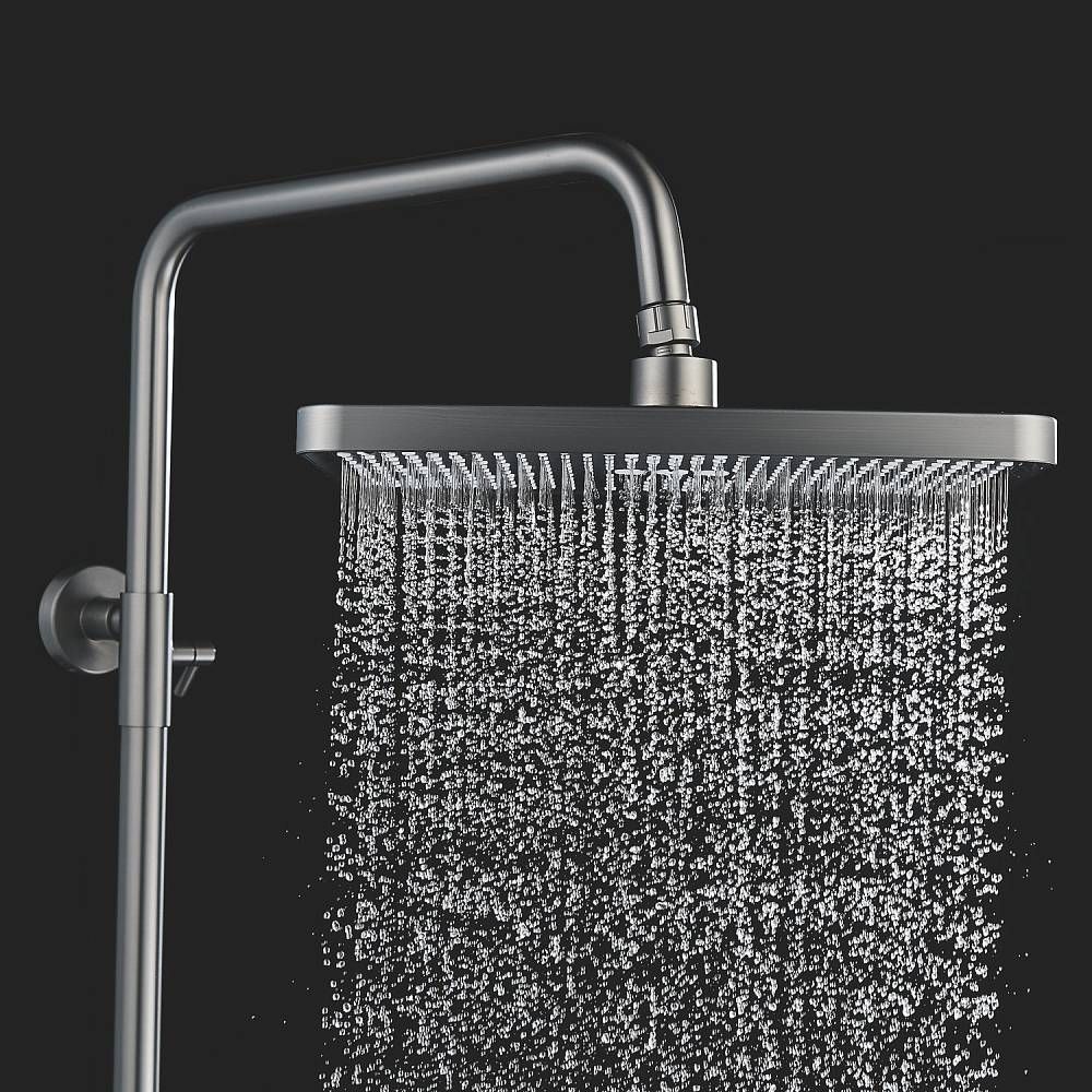 Верхний душ размером 305x205 мм из ABS-пластика регулируется по высоте благодаря телескопической штанге и по наклону с помощью встроенного шарнира, что обеспечивает максимальный комфорт и удобство использования. Самоочищающиеся силиконовые форсунки предотвращают образование известкового налета и сохраняют чистоту и силу потока воды.