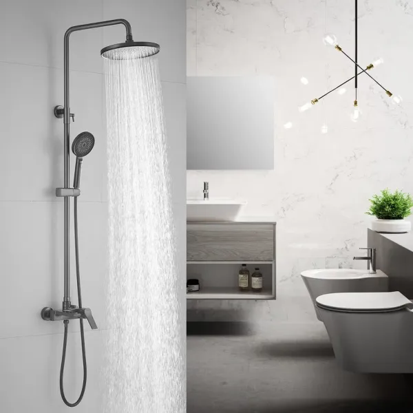 Душевая система Shevanik S8336T, оружейная сталь.Количество режимов струи: 3.Размер верхнего душа: 24,5x24,5 см.Управление: рычажное.Излив для наполнения ванны: да.