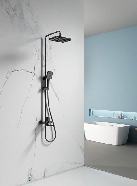 Душевая система Splenka S30.24.06, черный. Душевая система подходит для ванны и душа. Излив у системы имеет функцию переключения режима подачи воды. Верхний душ имеет прямоугольную форму размером 32 на 21 см. Ручная лейка у системы 3-х режимная. Лейки изготовлены из авс-пластика.