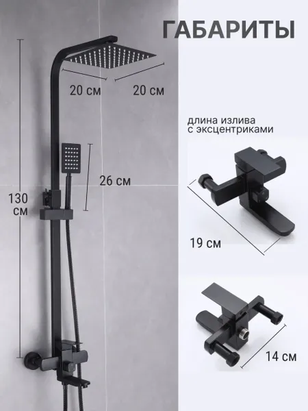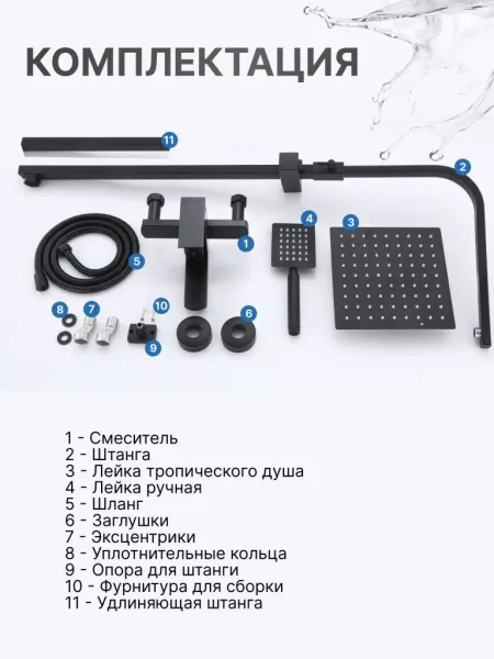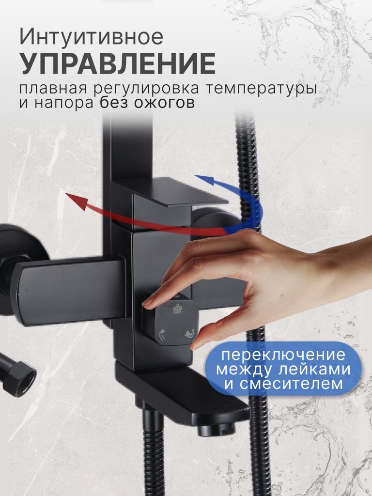 Душевой комплект содержит все необходимое для монтажа. Кроме того, наша душевая стойка черная имеет простой и быстрый монтаж, благодаря чему вы сможете установить ее самостоятельно без привлечения специалистов. Это позволит сэкономить время и деньги, а также получить удовольствие от процесса создания своего уютного уголка в ванной комнате.