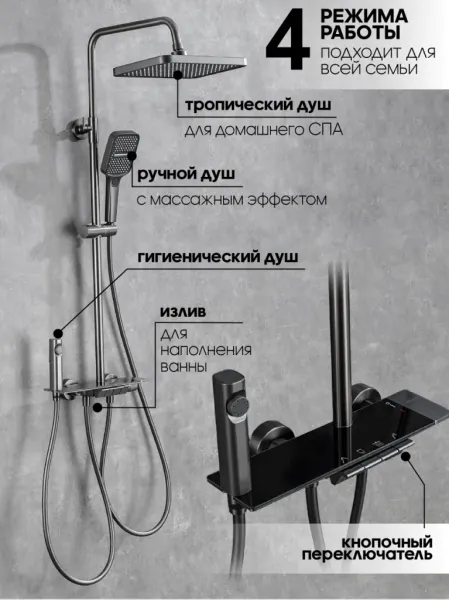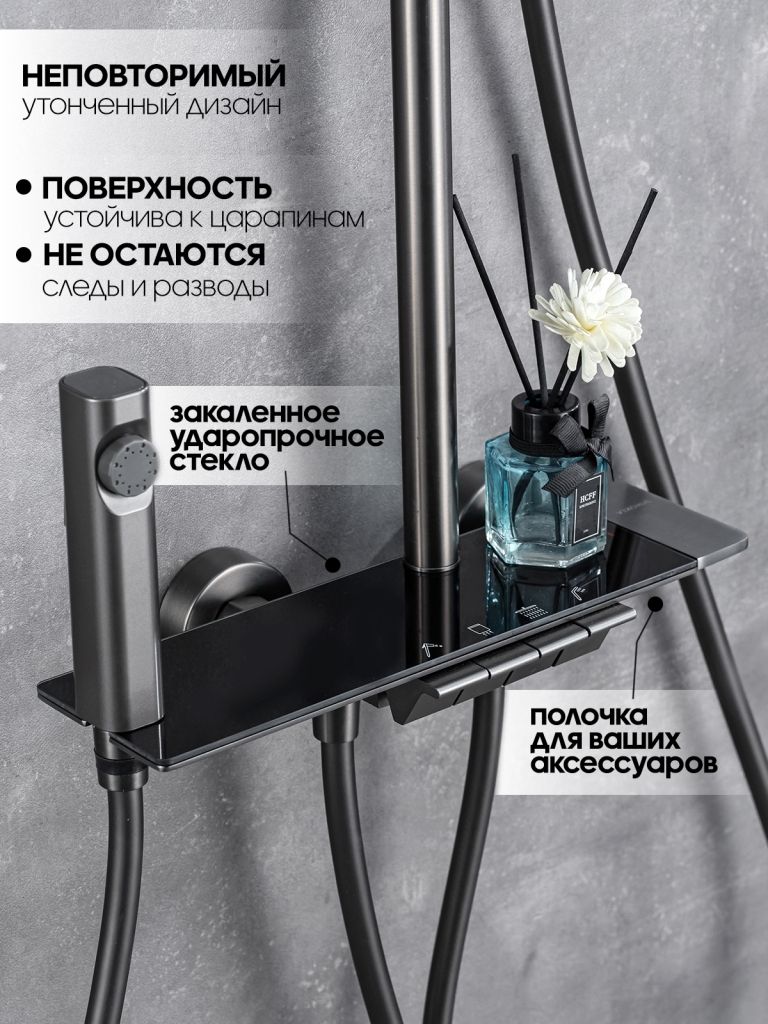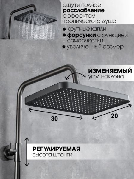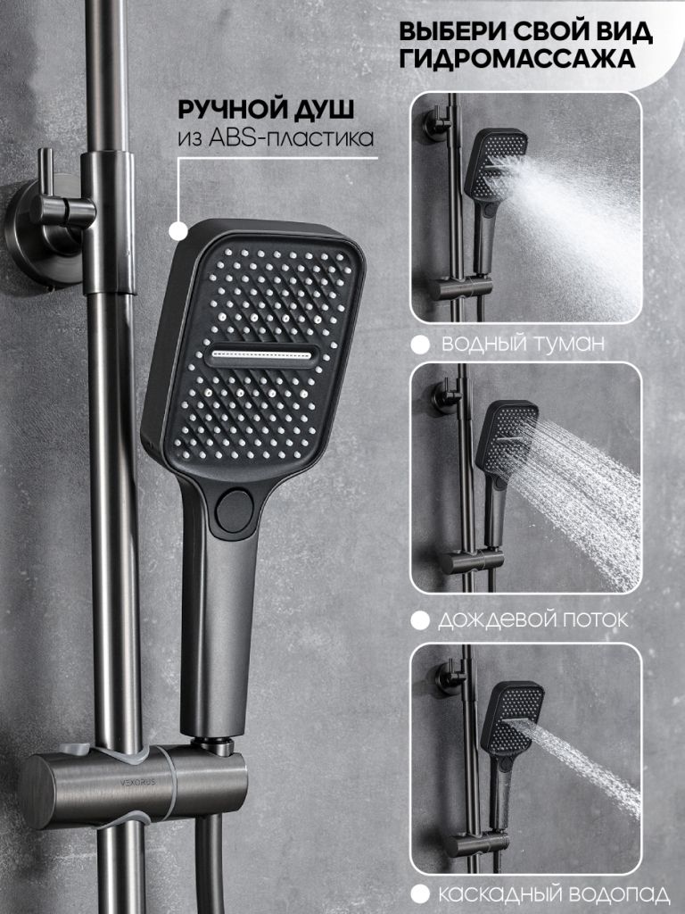 Душевая система с тропическим душем Vexorus - это система, которая превратит вашу ванную комнату в настоящий уголок роскоши и комфорта. Изделие выполнено в графитовом цвете, что позволяет гармонично его использовать в современном интерьере.