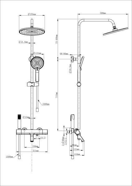Душевая система с термостатом WONZON & WOGHAND The ONE, Черный матовый (WW-B3094-MB)