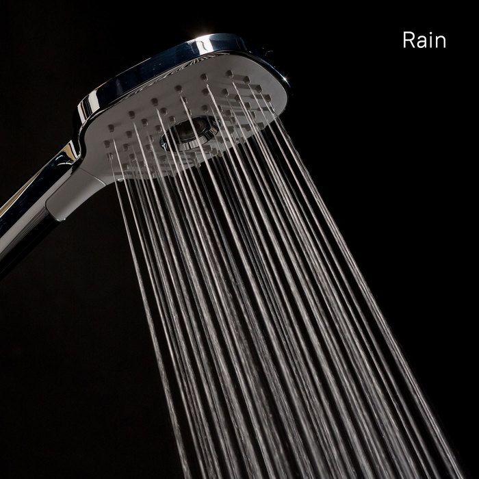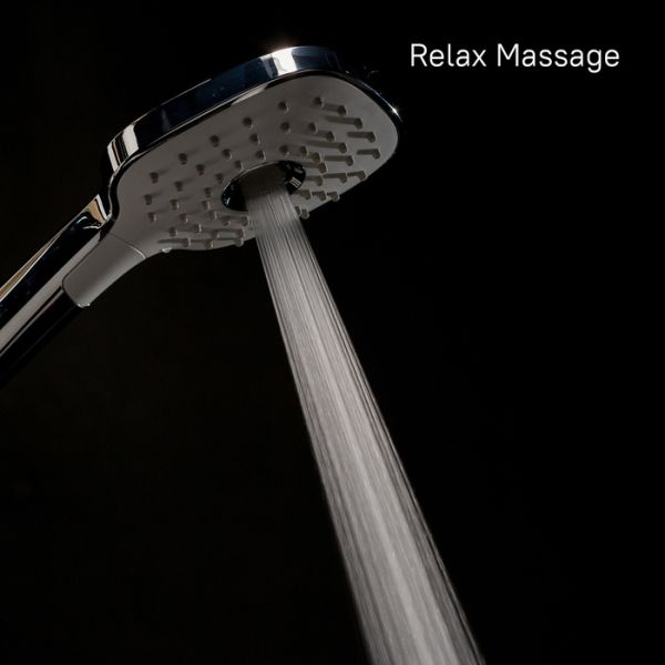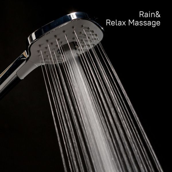Душевой гарнитур. Стойка из нержавеющей стали с никель-хромовым покрытием, диаметр 22 мм, высота 700 мм, держатель-слайдер. Лейка для душа из ABS-пластика, 3 режима (Rain, Relax-Massage, Rain&Relax-Massage), кнопочное переключение, встроенная мембрана из нержавеющей стали, размер 112х257 мм, цвет - белый/хром. Хромированная мыльница из ABS-пластика. Шланг для душа ПВХ в оплетке из нержавеющей стали, 1,5 метра, с системами Twist Free и Double Lock. В комплекте: крепеж.