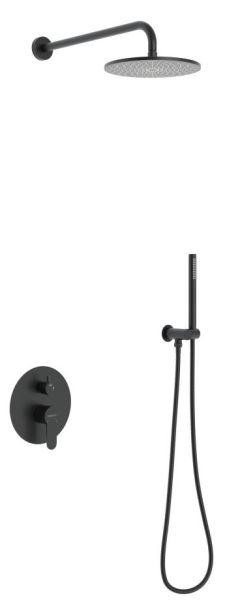 Душевой комплект BERGES NARDIS 2R BLACK - встраиваемый душевой комплект обладает двухрежимной системой и состоит из верхней лейки - «тропического ливня», ручного душа и смесителя. Лейка верхнего душа имеет инновационную систему самоочистки в виде гибких силиконовых вставок на форсунках душа, которые защищают изделие от известковых отложений. Комплект имеет матовое черное покрытие, которое выглядит безупречно на протяжении всего периода эксплуатации. Шланг выполнен из нержавеющей стали (внутри epdm), смеситель с латунным корпусом имеет керамический картридж с пропускной способностью 28 л/мин, все держатели и кронштейны сделаны из латуни и нержавеющей стали.Скрытый монтаж комплекта позволяет создавать красивое и эргономичное внутреннее пространство всего помещения.