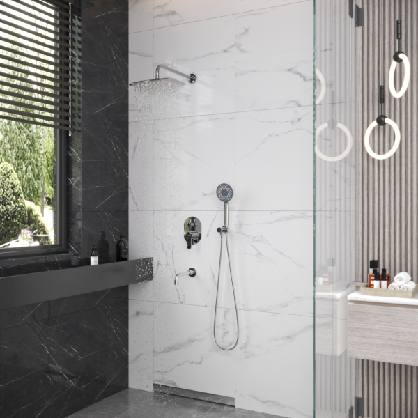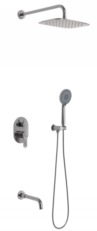 Душевой комплект BERGES VENTAS 3O - встраиваемый душевой комплект обладает трёхрежимной системой и состоит из верхней лейки - «тропического ливня», ручного душа, излива и смесителя.Лейка верхнего душа имеет инновационную систему самоочистки в виде гибких силиконовых вставок на форсунках душа, которые защищают изделие от известковых отложений. Верхний душ изготовлен из нержавеющей стали. Ручной душ – из ABS пластика. Оба душа имеют хромоникелевое покрытие, которое выглядит безупречно на протяжении всего периода эксплуатации.Шланг выполнен из нержавеющей стали (внутри epdm), смеситель с латунным корпусом имеет керамический картридж с пропускной способностью 28 л/мин, все держатели и кронштейны сделаны из латуни и нержавеющей стали.Скрытый монтаж комплекта позволяет создавать красивое и эргономичное внутреннее пространство всего помещения.