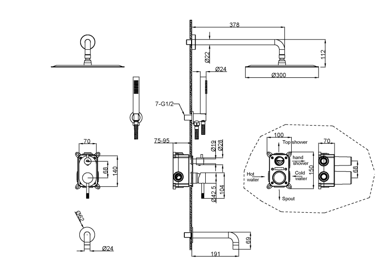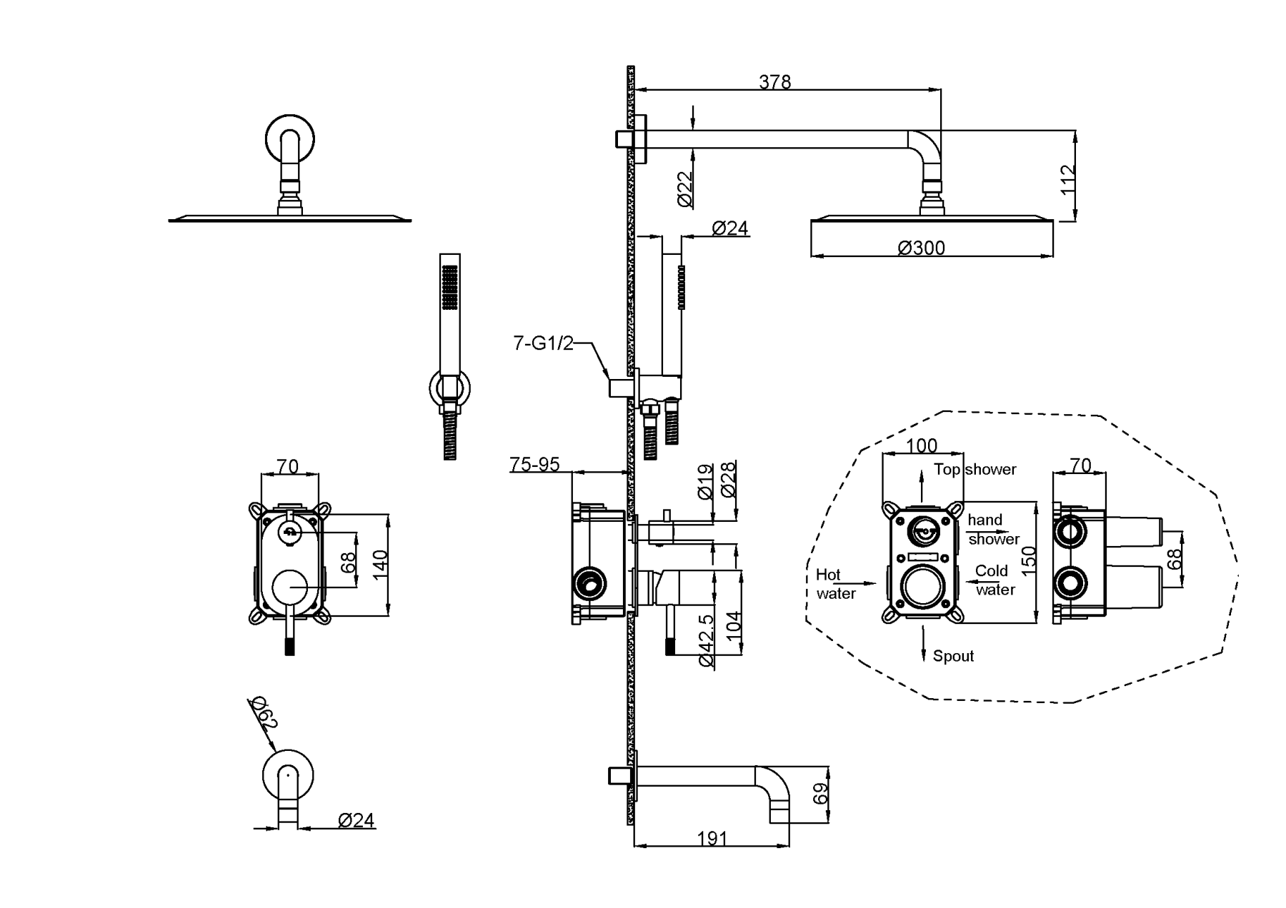 Комплектация: излив, смеситель, верхний душ, ручной душ.
