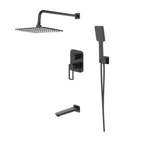 Готовый набор встраиваемой сантехники в стильном черном цвете включает всё необходимое для обустройства комфортной красивой ванной. Так выгоднее и удобнее, чем купить всё отдельно. Оптимальная подборка Slide: смеситель, верхняя лейка с кронштейном для тропического душа, излив, ручная лейка, душевой шланг и выход для шланга с держателем для лейки.