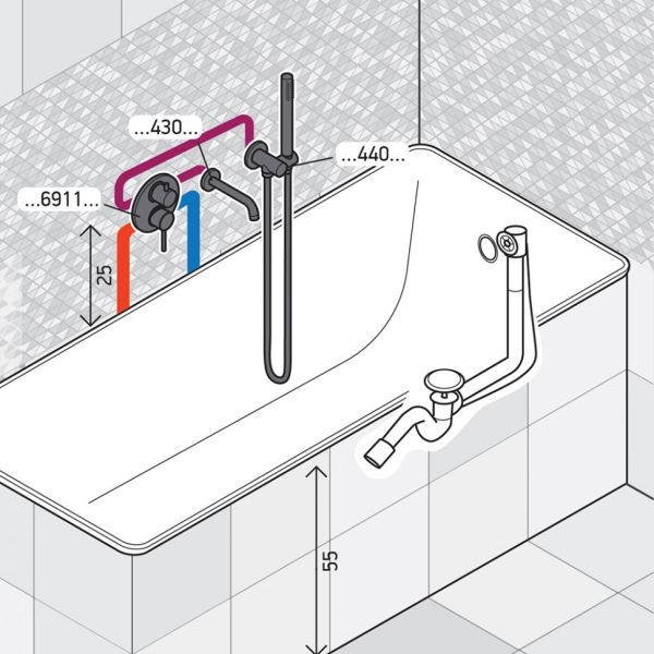 • Излив можно установить для набора воды в ванную или поставить в душевую зону.