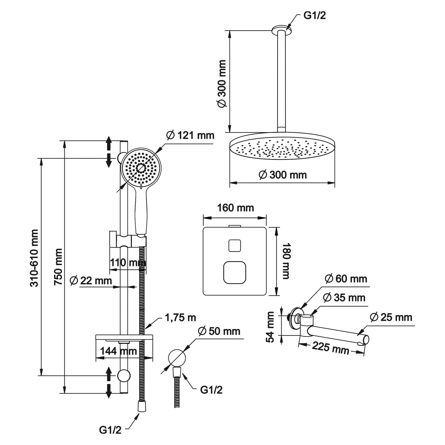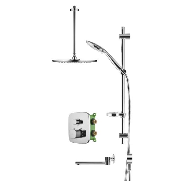 Душевой комплект со встраиваемым термостатическим смесителем на 3 выхода (в монтажном боксе), верхним душем ø300 мм, лейкой ø121 мм (3 режима) и поворотным изливом