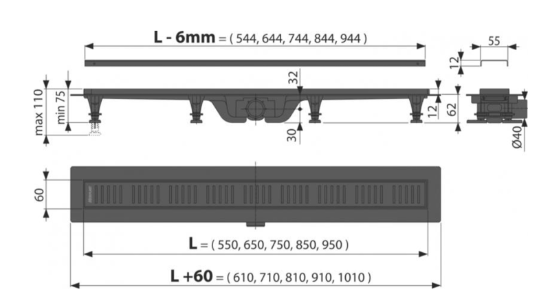 Душевой лоток AlcaPlast с порогами для перфорированной решетки 55см черный матовый APZ10BLACK-550M купить