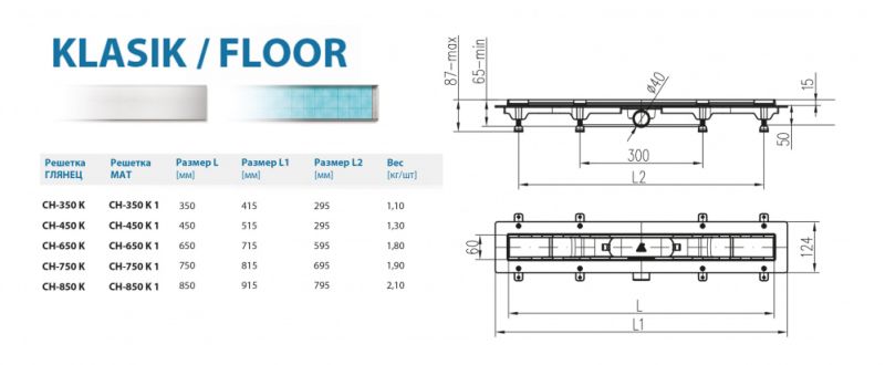 Водоотводящие желоба это атрибут для современного интерьера ванных комнат, сауны и зоны отдыха. Их преимуществом является простота установки, обслуживания и эксплуатация базбарьерной зоны. Монтаж можно производить как на открытых участках боксов и кабин, так и в близи стен. Нижняя часть изготовлена из ПП и ПС, решётка изготовлена из нержавеющей стали DIN 1.4301 K3 с возможной нагрузкой до 300 кг. Минимальная высота установки составляет 65 мм, желоб с регулировкой высоты. Комплект состоит: инструкция по установке, водоотводящий желоб, решётка, гидроизоляционный воротник по длине желоба, двойной комбинированный сифон, крепежный комплект (шурупы, дубели, рег. ножки).Характристики: * Низкая высота 65 мм