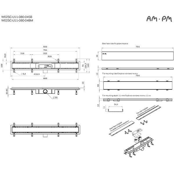 Душевой лоток AM.PM PrimeFlow 80 W02SC-U11-080-04SB с решеткой Хром матовый / под плитку Tile Подробнее
