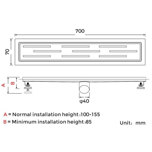 Линейный трап 70 см Gappo G87007-1, цвет сатин, изготовлен трап из нержавеющей стали. Минимальная монтажная высота 85 мм, боковой выпуск 40 мм, в комплекте переходник на 50 мм. Защита от запаха: комбинированный гидрозатвор, защита от проникновения запаха и жидкости из канализации.