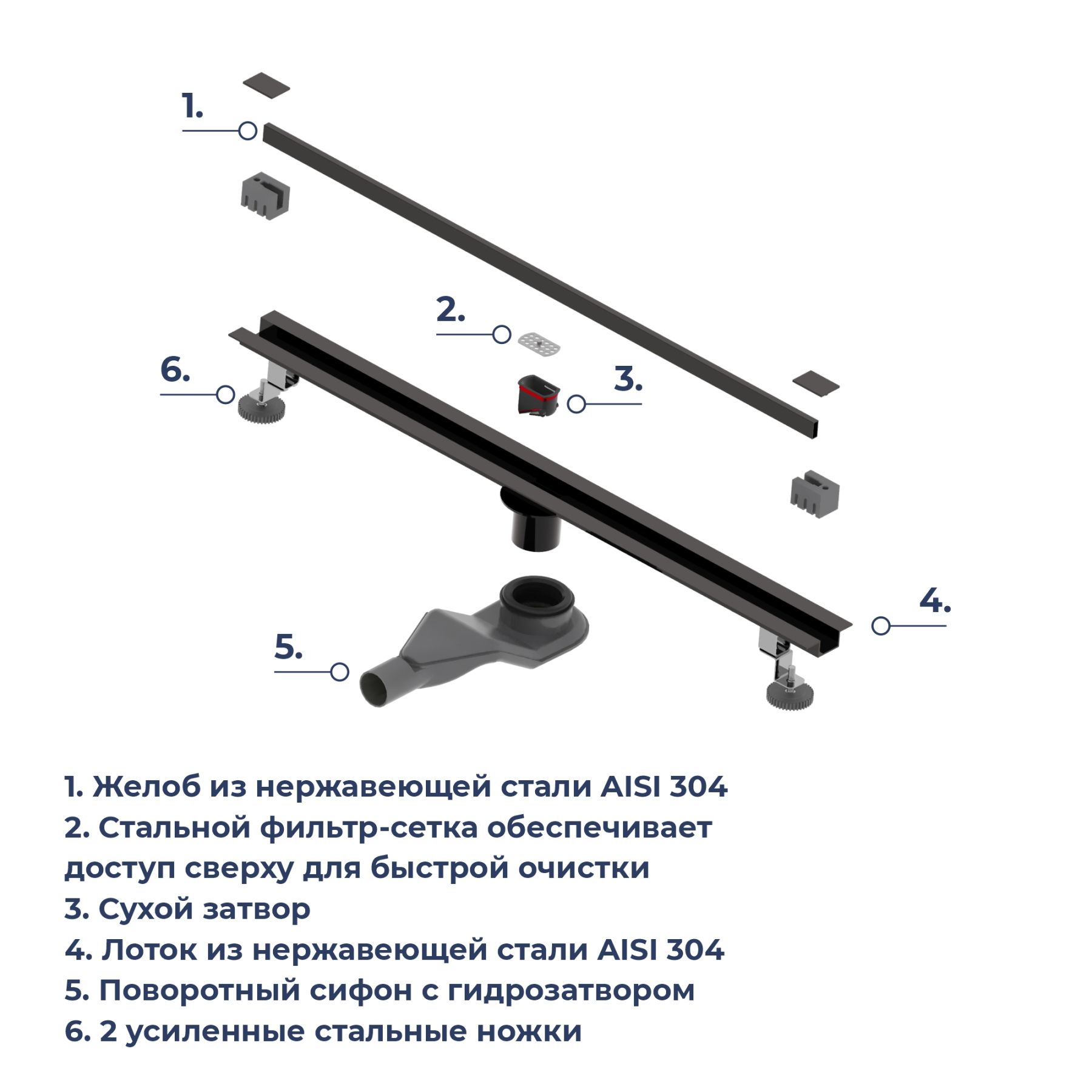 Принимающей декоративный жёлоб маскирует сливное устройство, образует щель, куда сливается вся вода из душевого пространства. Для того чтобы вода эффективно отводилась в трап, на этапе монтажа необходимо обеспечить уклон облицовочной плитки в сторону принимающего жёлоба.Для доступа к технической части устройства с целью очистки необходимо извлечь среднюю часть жёлоба вместе с боковыми декоративными заглушками.Лоток выполнен из нержавеющей стали толщиной 2 мм, собирает стекающую воду и за счёт технического уклона отводит её в сетку-фильтр, которая задерживает волосы и мелкий мусор.Далее вода проходит в сифон с комбинированным затвором, Первая вода сталкивается с сухим затвором, который изготовлен из высокопрочного ABS-пластика. Затвор выполнен в виде крышки с силиконовой прокладкой, крышка открывается под давлением воды и плотно притягивается при отсутствии воды за счёт пружинного механизма, обеспечивая 100% защиту от проникновения неприятных запахов в ванную комнату из канализации.После вода проходит через сифон с гидрозатвором и сливается в канализацию.Сифон с гидрозатвором присоединяется к нижней части лотка трапа и имеет боковой отвод с поворотом на 360 градусов, что позволяет подключить канализационный сток с любой стороны.