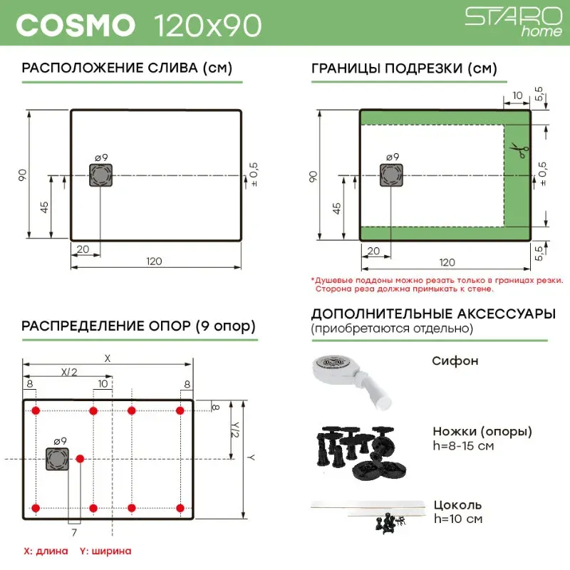 Душевые поддоны COSMO производятся на современном европейском оборудовании для европейского рынка. Контроль качества осуществляется на всех этапах производства. Нескользящая поверхность Antislip. Поверхность с имитацией сланца. Прочный (выдерживает вес свыше 300 кг). Высокая износостойкость. Стойкий к перепадам температур. Стойкий к воздействию химических веществ. Устойчивый к загрязнениям. Не меняет цвет от времени. Экологически нейтральный материал. Теплый на ощупь, приятный тактильный эффект. Хорошее шумопоглощение (в отличие от стали и акрила). Легко моется с использованием бытовых моющих средств. Возможность подрезки под индивидуальный размер. Гарантия 3 года.
