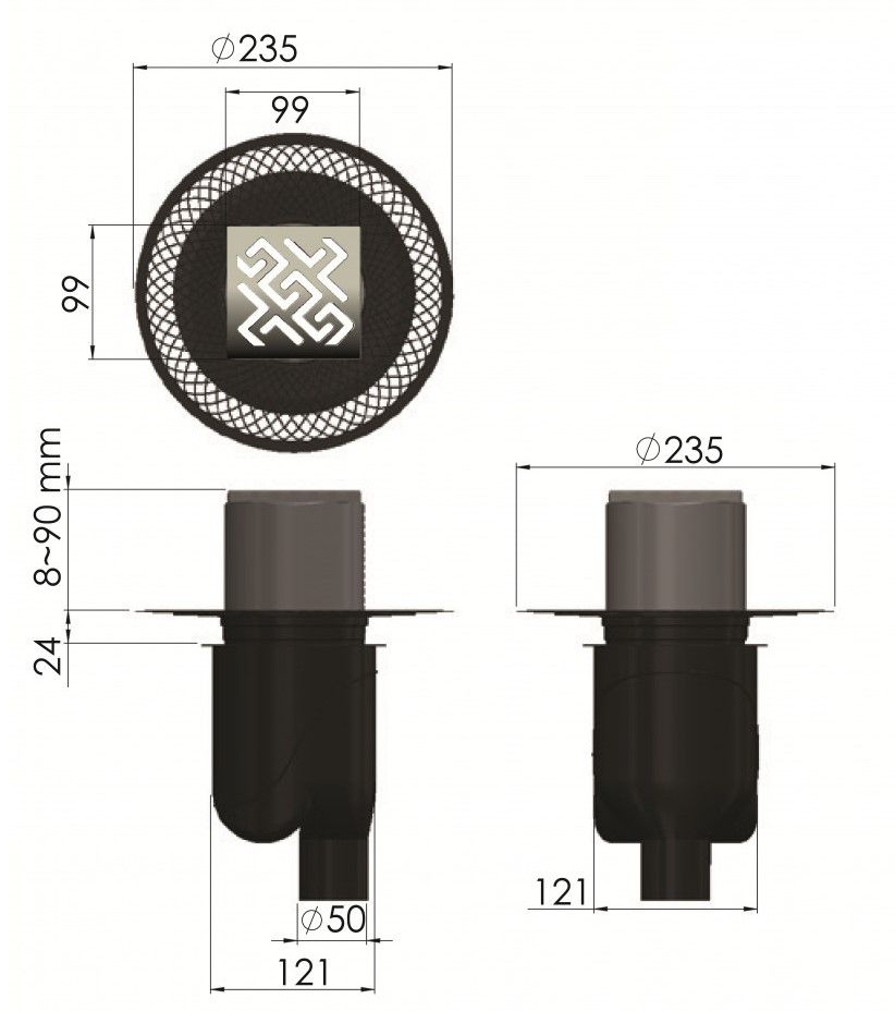 Решетка толщина 3мм, нержавеющая сталь AISI 304Горловина трапа, пластикФланец трапа с переходником, РРМонтажная заглушка, PPСамопромывной S-образный сифон PP:Вертикальный выпуск, пропускная способность 48л/мин, монтаж 360°Монтажный ключ, пластик