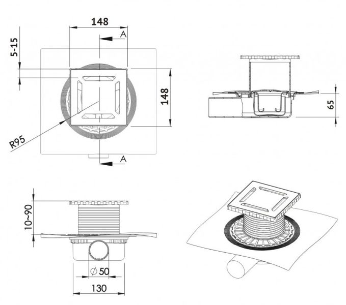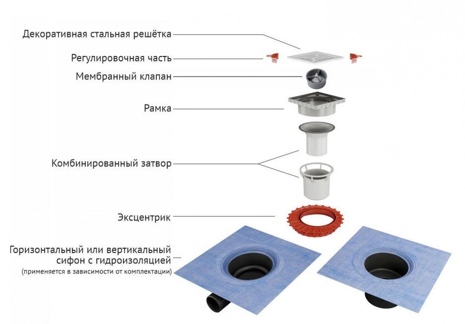 Решетка толщина 3мм, нержавеющая сталь AISI 304Горловина трапа и эксцентрик, пластикМонтажная заглушка, PPСифон PP с гидроизоляциейГоризонтальный выпуск D50 H65, монтаж 360°Комбинированный затворФланец с 3 сторон загибается на 90°Монтажный ключ, пластик