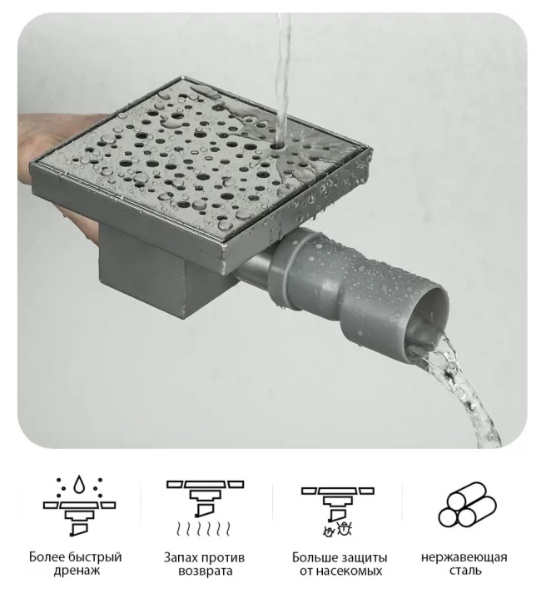 Квадратный трап для душа Gappo G81515-2, размер 15 * 15 см, цвет сатин, изготовлен трап из нержавеющей стали. Боковой выпуск 40 мм, в комплекте переходник на 50 мм. Защита от запаха: комбинированный гидрозатвор, защита от проникновения запаха и жидкости из канализации.