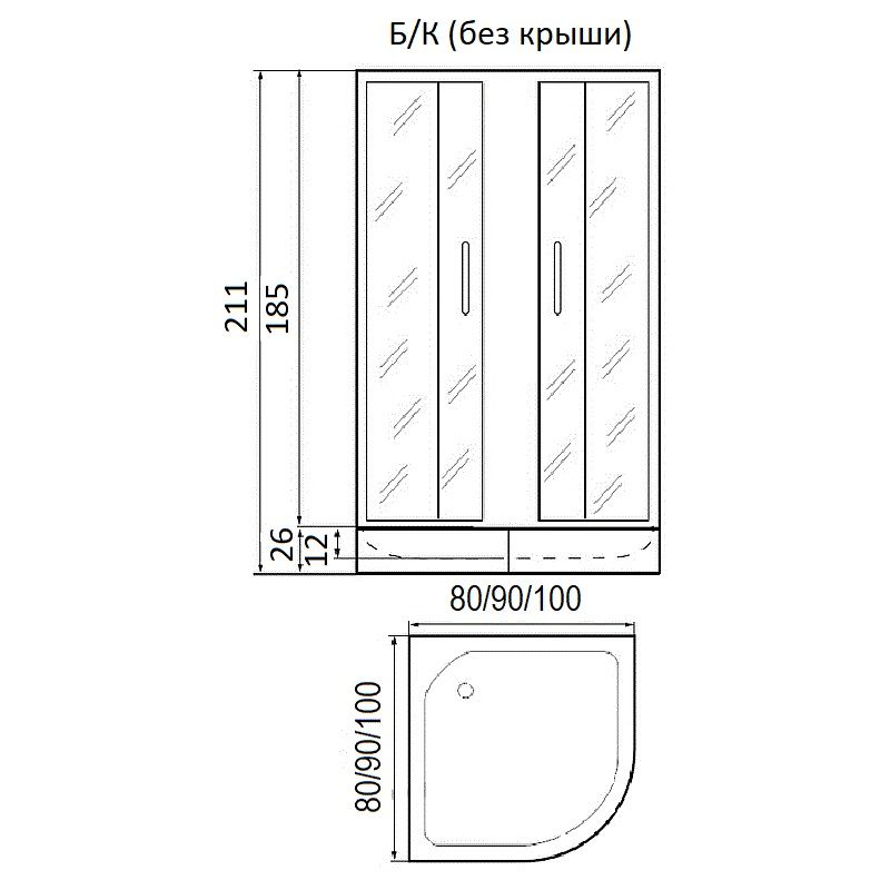 Типы и размеры:без поддона 100*100*185с поддоном 100*100*211 Матовое стекло, профиль матовый хромДушевое ограждение для ванной комнаты полукруглое с боковым регулировочным профилем и саморегулирующимися металическами, хромированными, двойными роликами.