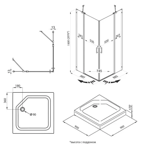 Душевой уголок Размер: 90 x 90 x 190 см Высота с поддоном: 207 см Конструкция дверей... Подробнее