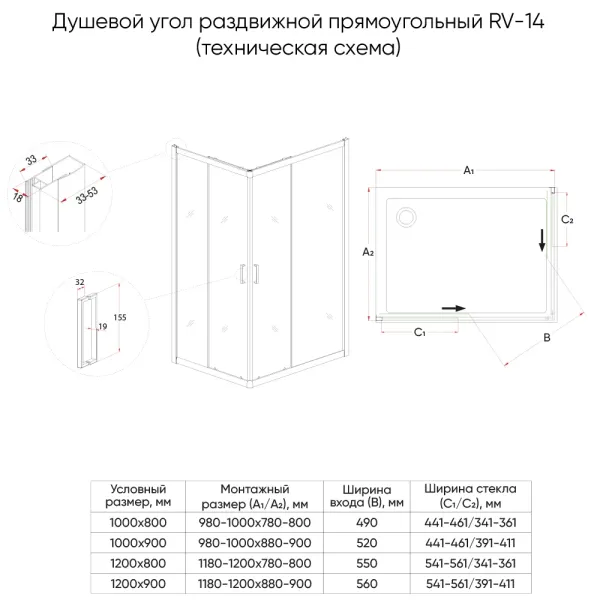 Душевой уголок Veconi Rovigo RV-14, 1200x1000x1950, черный, стекло прозрачное купить