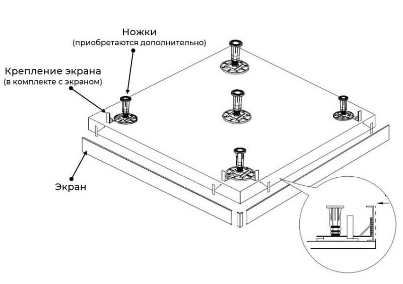 Комплектация: 2 экрана (фронтальный и боковой), соединительный уголок, крепление к ножкам на которые устанавливается поддон.