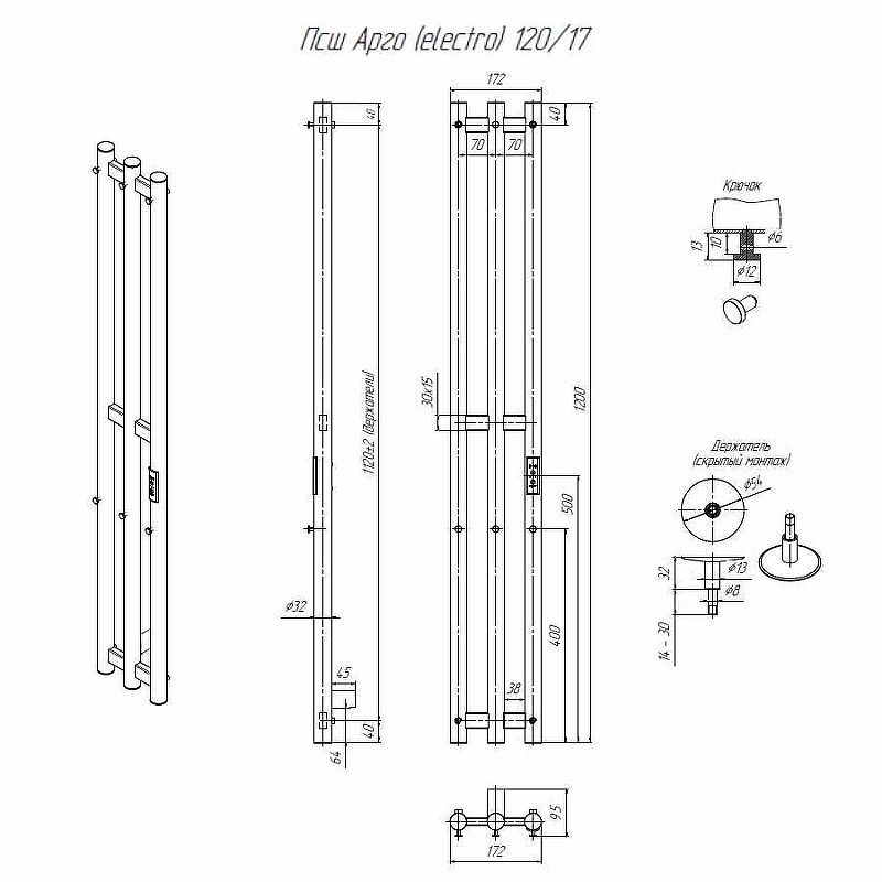 Электрический полотенцесушитель Altasan Арго Арго12017ЧМ Черный муар 120х17Данный полотенцесушитель имеет два вида подключения: подключение стандартным кабелем с вилкой 220 Вольт и скрытое подключение к заранее подведенной на месте установки проводке. Во втором случае необходимо обжать жилы проводки дополнительными клемниками(идут в комплекте) и подсоединить их к жилам полотенцесушителя, согласно цветовой разметки.