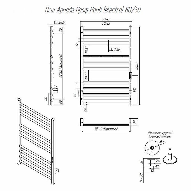 Электрический полотенцесушитель Altasan АрмадаПроф АрмадаПрофР8050ЧМ Черный муар 80х50Данный полотенцесушитель имеет два вида подключения: подключение стандартным кабелем с вилкой 220 Вольт и скрытое подключение к заранее подведенной на месте установки проводке. Во втором случае необходимо обжать жилы проводки дополнительными клемниками(идут в комплекте) и подсоединить их к жилам полотенцесушителя, согласно цветовой разметки. Подключение можно осуществить, как по левой стороне, так и по правой (имеются соответствующие отводы на каждой из вертикальных труб).