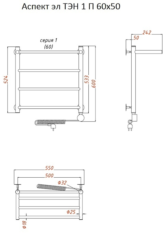 Внимание! Для скрытого монтажа электропроводки необходимо приобрести комплект скрытого подключения.Полотенцесушитель электрический комплектуется ТЭНом с терморегулятором и таймером.Изделие производится из нержавеющей стали AISI 201. Вертикальные трубы d -32 мм., для горизонтальных вставок используется труба d — 18 мм.Нагревательным элементом в полотенцесушителе является ТЭН. Полотенцесушитель заполнен бытовым антифризомЭкономичность: ТЭН нагревает антифриз до нужной температуры и выключается, далее при остывании полотенцесушителя он включается опять. Таким образом он работает не постоянно и получается, что ТЭН потребляет электричество не 300 Вт, а порядка 100 — 150 ВтМощность электрического прибора порядка 100 Вт при стоимости 1 Вт — 5 руб несложно посчитать: 100Вт х 24 = 2,4 кВт в сутки. Стоимость эксплуатации изделия за сутки 2,4 кВт х 5 руб. = 12 руб. При максимальной температуре расход электричества за 30 дней составит порядка 360 руб. При условии если сушка работает круглосуточно на максимальной температуре.Удобство монтажа: Полотенцесушитель крепится к стене на четыре держателя. Изначально ТЭН не установлен в полотенцесушитель для безопасной транспортировки, его можно установить, как справа, так и слева предварительно перевернув полотенцесушитель вверх ногами и выкрутив заглушку с нужной стороны на место в которое установится ТЭН.Примечание. Внимательно изучите инструкцию по установке ТЭНа!Скрытое подключение: Для скрытого монтажа электропроводки необходимо приобрести комплект скрытого подключения.Подключение в розетку: В комплекте с ТЭНом имеется шнур с вилкой, который будет необходим при подключении к розетке.