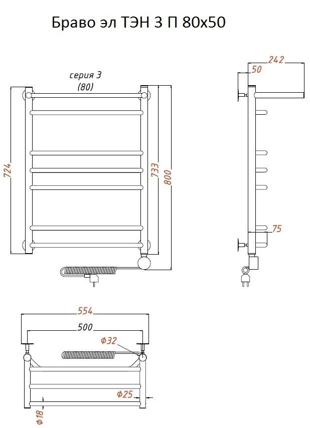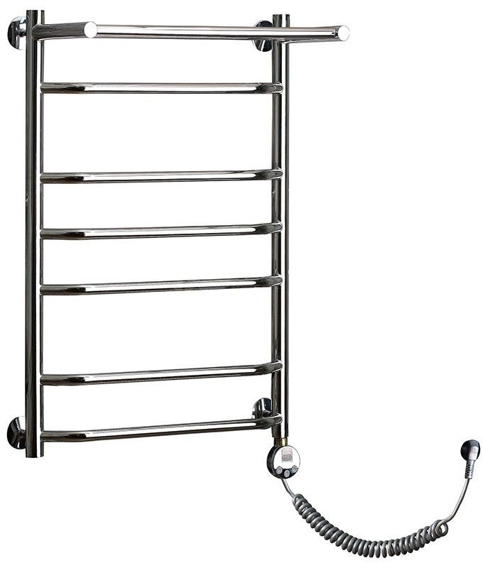 Внимание! Для скрытого монтажа электропроводки необходимо приобрести комплект скрытого подключения. Полотенцесушитель электрический комплектуется ТЭНом с терморегулятором и таймером. Изделие производится из нержавеющей стали AISI 201. Вертикальные трубы d -32 мм., для горизонтальных вставок используется труба d — 18 мм. Нагревательным элементом в полотенцесушителе является ТЭН. Полотенцесушитель заполнен бытовым антифризом.Экономичность: ТЭН нагревает антифриз до нужной температуры и выключается, далее при остывании полотенцесушителя он включается опять. Таким образом он работает не постоянно, и получается, что ТЭН потребляет электричество не 300 Вт, а порядка 100 — 150 Вт.Мощность электрического прибора порядка 100 Вт при стоимости 1 Вт — 5 руб несложно посчитать: 100Вт х 24 = 2,4 кВт в сутки. Стоимость эксплуатации изделия за сутки 2,4 кВт х 5 руб. = 12 руб. При максимальной температуре расход электричества за 30 дней составит порядка 360 руб. При условии если сушка работает круглосуточно на максимальной температуре.Удобство монтажа: Полотенцесушитель крепится к стене на четыре держателя. Изначально ТЭН не установлен в полотенцесушитель для безопасной транспортировки, его можно установить, как справа, так и слева предварительно перевернув полотенцесушитель вверх ногами и выкрутив заглушку с нужной стороны на место в которое установится ТЭН.Примечание. Внимательно изучите инструкцию по установке ТЭНа!Скрытое подключение: Для скрытого монтажа электропроводки необходимо приобрести комплект скрытого подключения.Подключение в розетку: В комплекте с ТЭНом имеется шнур с вилкой, который будет необходим при подключении к розетке.