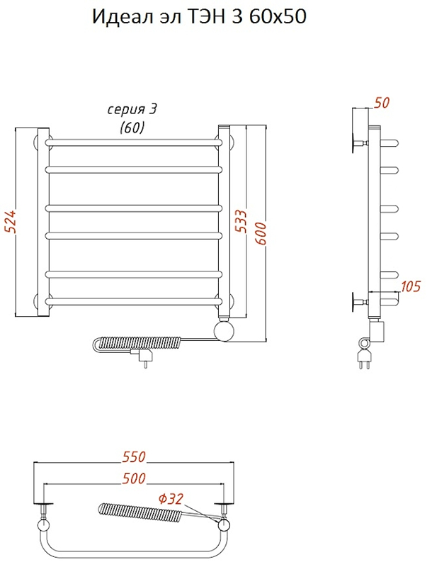 Внимание! Для скрытого монтажа электропроводки необходимо приобрести комплект скрытого подключения.Полотенцесушитель электрический комплектуется ТЭНом с терморегулятором и таймером.Изделие производится из нержавеющей стали AISI 201. Вертикальные трубы d -32 мм., для горизонтальных вставок используется труба d — 18 мм.Нагревательным элементом в полотенцесушителе является ТЭН. Полотенцесушитель заполнен бытовым антифризомЭкономичность: ТЭН нагревает антифриз до нужной температуры и выключается, далее при остывании полотенцесушителя он включается опять. Таким образом он работает не постоянно и получается, что ТЭН потребляет электричество не 300 Вт, а порядка 100 — 150 ВтМощность электрического прибора порядка 100 Вт при стоимости 1 Вт — 5 руб несложно посчитать: 100Вт х 24 = 2,4 кВт в сутки. Стоимость эксплуатации изделия за сутки 2,4 кВт х 5 руб. = 12 руб. При максимальной температуре расход электричества за 30 дней составит порядка 360 руб. При условии если сушка работает круглосуточно на максимальной температуре.Удобство монтажа: Полотенцесушитель крепится к стене на четыре держателя. Изначально ТЭН не установлен в полотенцесушитель для безопасной транспортировки, его можно установить, как справа, так и слева предварительно перевернув полотенцесушитель вверх ногами и выкрутив заглушку с нужной стороны на место в которое установится ТЭН.Примечание. Внимательно изучите инструкцию по установке ТЭНа!Скрытое подключение: Для скрытого монтажа электропроводки необходимо приобрести комплект скрытого подключения.Подключение в розетку: В комплекте с ТЭНом имеется шнур с вилкой, который будет необходим при подключении к розетке.