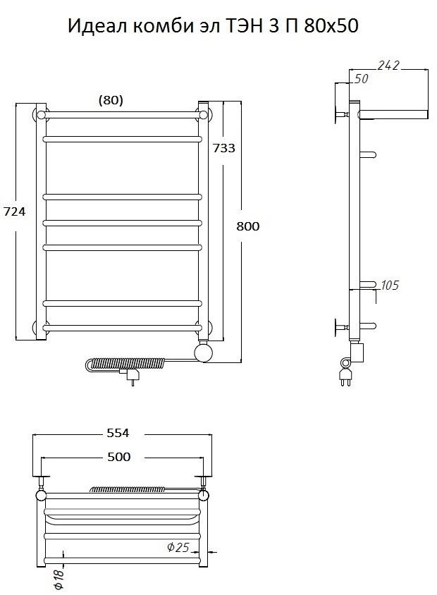 Внимание! Для скрытого монтажа электропроводки необходимо приобрести комплект скрытого подключения. Полотенцесушитель электрический комплектуется ТЭНом с терморегулятором и таймером. Изделие производится из нержавеющей стали AISI 201. Вертикальные трубы d -32 мм., для горизонтальных вставок используется труба d — 18 мм. Нагревательным элементом в полотенцесушителе является ТЭН. Полотенцесушитель заполнен бытовым антифризом.Экономичность: ТЭН нагревает антифриз до нужной температуры и выключается, далее при остывании полотенцесушителя он включается опять. Таким образом он работает не постоянно, и получается, что ТЭН потребляет электричество не 300 Вт, а порядка 100 — 150 Вт.Мощность электрического прибора порядка 100 Вт при стоимости 1 Вт — 5 руб несложно посчитать: 100Вт х 24 = 2,4 кВт в сутки. Стоимость эксплуатации изделия за сутки 2,4 кВт х 5 руб. = 12 руб. При максимальной температуре расход электричества за 30 дней составит порядка 360 руб. При условии если сушка работает круглосуточно на максимальной температуре.Удобство монтажа: Полотенцесушитель крепится к стене на четыре держателя. Изначально ТЭН не установлен в полотенцесушитель для безопасной транспортировки, его можно установить, как справа, так и слева предварительно перевернув полотенцесушитель вверх ногами и выкрутив заглушку с нужной стороны на место в которое установится ТЭН.Примечание. Внимательно изучите инструкцию по установке ТЭНа!Скрытое подключение: Для скрытого монтажа электропроводки необходимо приобрести комплект скрытого подключения.Подключение в розетку: В комплекте с ТЭНом имеется шнур с вилкой, который будет необходим при подключении к розетке.