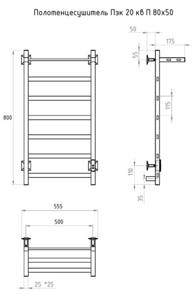 ПЭК — Полотенцесушитель электрический кабельный. Изделие производится из нержавеющей стали AISI 201. Вертикальные трубы d -32 мм., для горизонтальных вставок используется труба d — 18 мм.Нагревательным элементом в полотенцесушителе является греющий кабель — аналог «теплого пола», кабель заправляется внутрь каждой трубы и передает тепло на поверхность изделия. Во включенном состоянии постоянно поддерживается температура 50-600.Экономичность: Полотенцесушитель снабжен панелью управления. Кнопка включения/выключения и таймер на 2 часа и 4 часа, который позволяет включать изделие на ограниченное время. Эта функция дает возможность экономить электричество.Мощность электрического прибора порядка 60W при стоимости 1 кВт — 5 руб несложно посчитать: 60W х 24 = 1,5 кВт в сутки. Стоимость эксплуатации изделия за сутки 1,5 кВт х 5 руб. = 7,5 руб. Максимальный расход электричества за месяц примерно 225 руб. При условии если сушка работает круглосуточно.Удобство монтажа: Полотенцесушитель крепится к стене на четыре держателя. Универсальное исполнение изделия позволяет подключить его, как справа, так и слева.Скрытое подключение: Благодаря приваренным в нижней части вертикальных труб двум распаячным коробкам, в которых соединяется электропроводка, возможно скрытое подключение к электричеству слева и справа.Подключение в розетку: В комплекте также имеется шнур с вилкой, который будет необходим при подключении к розетке.Панель включения:РЕЖИМ №1 — постоянный нагревРЕЖИМ №2 — работа в течение 2 часов с последующим отключением.РЕЖИМ №3 — работа в течение 4 часов с последующим отключением.