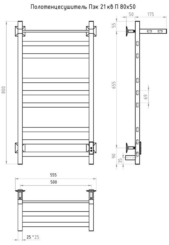 ПЭК — Полотенцесушитель электрический кабельный. Изделие производится из нержавеющей стали AISI 201. Вертикальные трубы d -32 мм., для горизонтальных вставок используется труба d — 18 мм.Нагревательным элементом в полотенцесушителе является греющий кабель — аналог «теплого пола», кабель заправляется внутрь каждой трубы и передает тепло на поверхность изделия. Во включенном состоянии постоянно поддерживается температура 50-600.Экономичность: Полотенцесушитель снабжен панелью управления. Кнопка включения/выключения и таймер на 2 часа и 4 часа, который позволяет включать изделие на ограниченное время. Эта функция дает возможность экономить электричество.Мощность электрического прибора порядка 60W при стоимости 1 кВт — 5 руб несложно посчитать: 60W х 24 = 1,5 кВт в сутки. Стоимость эксплуатации изделия за сутки 1,5 кВт х 5 руб. = 7,5 руб. Максимальный расход электричества за месяц примерно 225 руб. При условии если сушка работает круглосуточно.Удобство монтажа: Полотенцесушитель крепится к стене на четыре держателя. Универсальное исполнение изделия позволяет подключить его, как справа, так и слева.Скрытое подключение: Благодаря приваренным в нижней части вертикальных труб двум распаячным коробкам, в которых соединяется электропроводка, возможно скрытое подключение к электричеству слева и справа.Подключение в розетку: В комплекте также имеется шнур с вилкой, который будет необходим при подключении к розетке.Панель включения:РЕЖИМ №1 — постоянный нагревРЕЖИМ №2 — работа в течение 2 часов с последующим отключением.РЕЖИМ №3 — работа в течение 4 часов с последующим отключением.