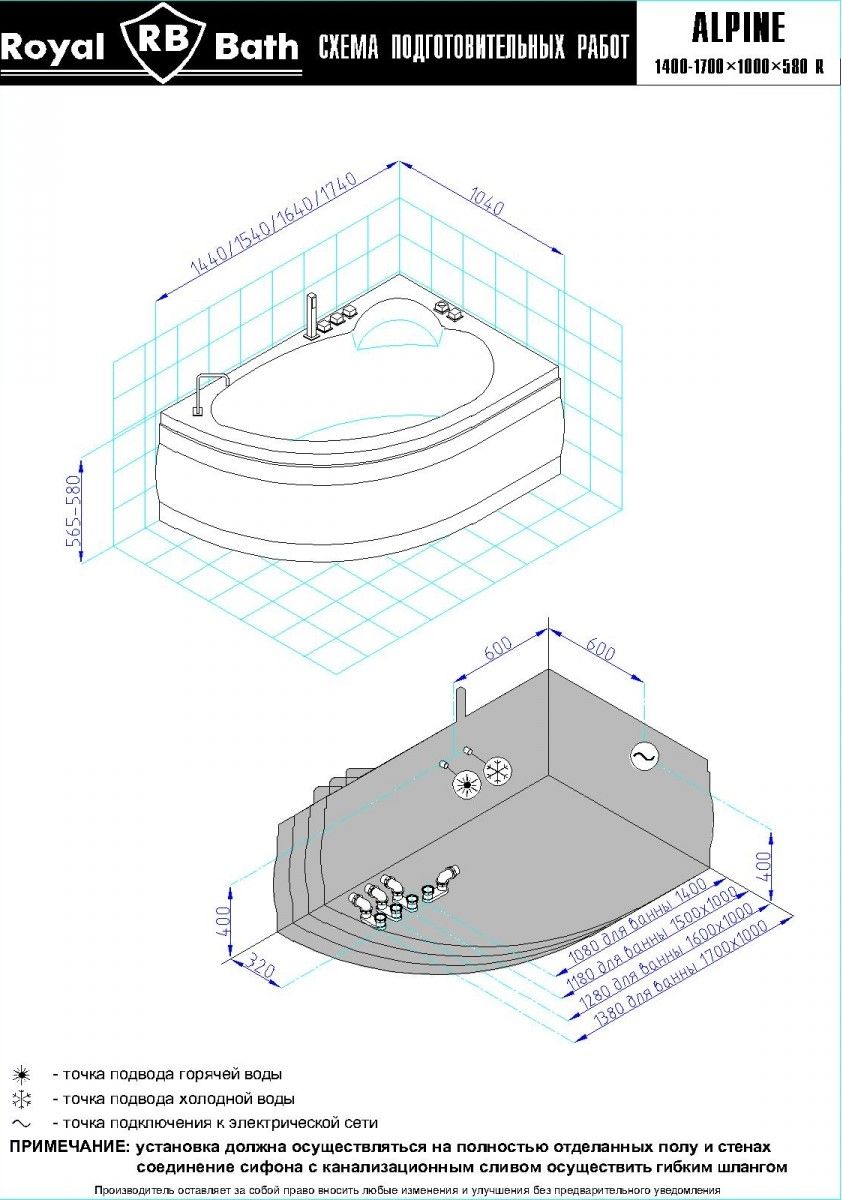 Акриловая ванна Royal Bath - идеальный выбор для создания атмосферы релакса и умиротворения, как в просторной в ванной комнате, так и в комнатном санузле. Основным преимуществом ванны из акрила считается её малый вес, высокая гигиеничность данного материала и низкая теплопроводность, долго сохраняющая комфортную температуру воды.Форма ванны Royal Bath замечательно подойдет к любому интерьерному решению, в различных вариантах размещения внутри ванной комнаты. Пристенная установка - это наиболее традиционный вид установки, а при использовании декоративного экрана пространство под ванной можно использовать как место хранения моющих средств. Оптимальная глубина позволяет принимать ванну с максимальным комфортом и полным расслаблением. Ванна Royal Bath выполнена со строгим соблюдением всех значительных элементов современного стиля.Благодаря тому, что родина бренда Royal Bath - Россия, можно смело быть уверенным в непревзойденном качестве и долговечности ванны, так как производство полностью соответствует стандартам качества. Акриловая ванна Royal Bath - это незаменимый, основной элемент любой ванной комнаты, без которого невозможно обойтись, ни в многоквартирном доме, ни в загородном коттедже.Комплектация гидромассажной ванны:- акриловая ванна Alpine 170x100x58;- каркас сварной к ванне Alpine 170;- панель к ванне Alpine 170;- гидромассажная система на 6 форсунок;- слив-перелив для ванны полуавтомат 60 см.Ожидаемый срок поставки 7 дней.Обратите внимание: данная позиция поставляется под заказ! Товар поставляется по 100%-ной предоплате.Данный товар является заказным и имеет индивидуально-определенные свойства.