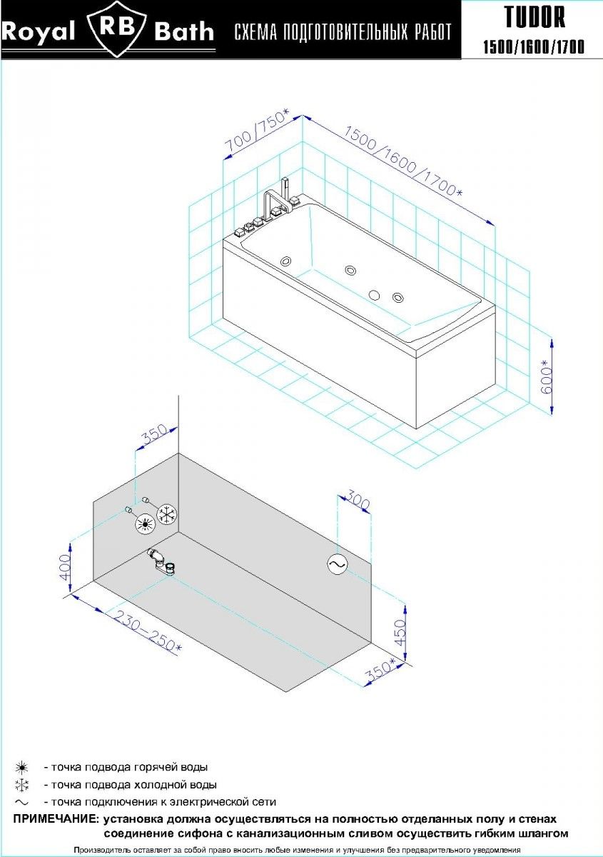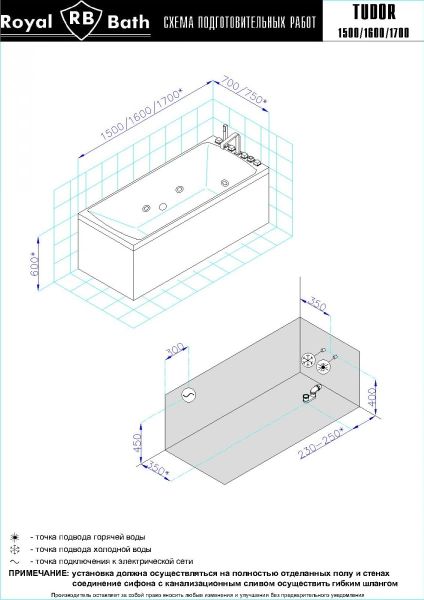 Акриловая ванна Royal Bath - идеальный выбор для создания атмосферы релакса и умиротворения, как в просторной в ванной комнате, так и в комнатном санузле. Основным преимуществом ванны из акрила считается её малый вес, высокая гигиеничность данного материала и низкая теплопроводность, долго сохраняющая комфортную температуру воды.Форма ванны Royal Bath замечательно подойдет к любому интерьерному решению, в различных вариантах размещения внутри ванной комнаты. Пристенная установка - это наиболее традиционный вид установки, а при использовании декоративного экрана пространство под ванной можно использовать как место хранения моющих средств. Оптимальная глубина позволяет принимать ванну с максимальным комфортом и полным расслаблением. Ванна Royal Bath выполнена со строгим соблюдением всех значительных элементов современного стиля.Благодаря тому, что родина бренда Royal Bath - Россия, можно смело быть уверенным в непревзойденном качестве и долговечности ванны, так как производство полностью соответствует стандартам качества. Акриловая ванна Royal Bath - это незаменимый, основной элемент любой ванной комнаты, без которого невозможно обойтись, ни в многоквартирном доме, ни в загородном коттедже.Комплектация гидромассажной ванны:- акриловая ванна Tudor 170x75x60;- каркас сварной к ванне Tudor 170;- панель фронтальная к ванне Tudor 170;- панель боковая Tudor/Vienna 70 L;- панель боковая Tudor/Vienna 70 R;- гидромассажная система на 6 форсунок;- слив-перелив для ванны полуавтомат 60 см.Ожидаемый срок поставки 7 дней.Обратите внимание: данная позиция поставляется под заказ! Товар поставляется по 100%-ной предоплате.Данный товар является заказным и имеет индивидуально-определенные свойства.