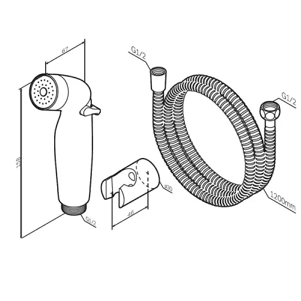 Гигиенический душ AM.PM F0202032 со шлангом и держателем хромГигиеническая лейка АM.PM в комплекте с шланговым подсоединением-держателем и шлангом. Размер (Ш/Г/В): 32x67x158 мм. Длина душевого шланга - 1200 мм. Размер ручного душа - 32 мм. Материал - латунь. Цвет - хром.