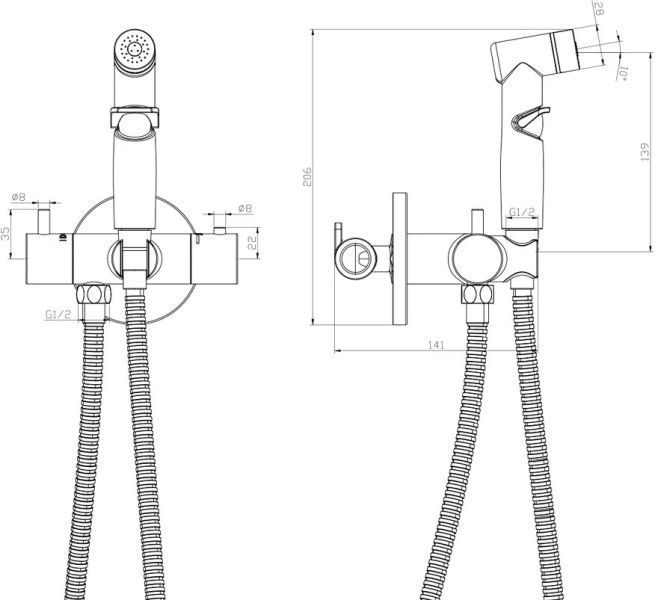 - Аксессуары в комплекте (шланг 1,2 м, лейка гигиенического душа с нажимным механизмом)