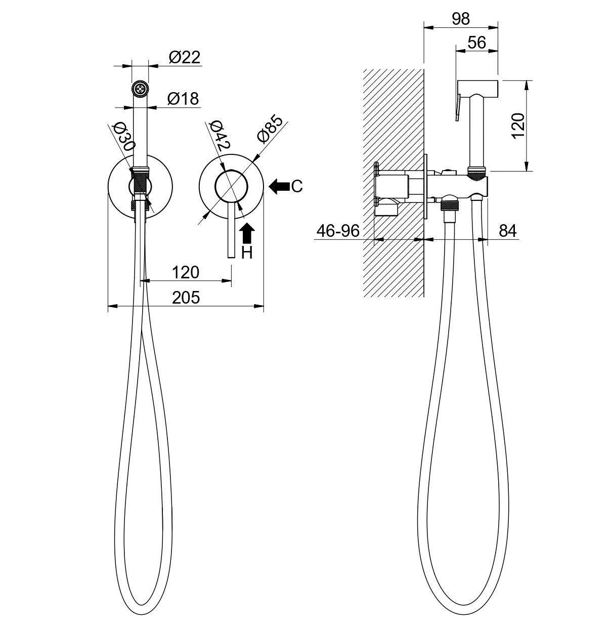 • Душевой гарнитур: гигиеническая лейка, шланг, шланговое подсоединение с держателем