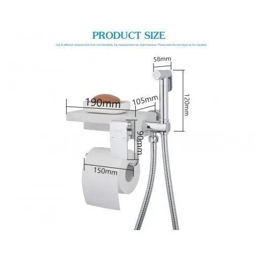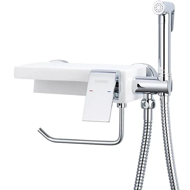 Смеситель встраиваемый Gappo G7296 с гигиеническим душем, полочкой и бумагодержателем. Корпус смесителя изготовлен из латуни с хромированным покрытием, полочка из искусственного камня белый кварц. Душевой шланг в комплекте.
