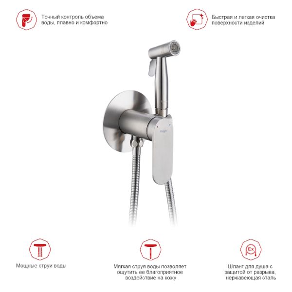 Гигиенический душ со смесителем скрытого (внутреннего) монтажа представляет собой удобный альтернативный вариант стандартному биде. Изготовлен из нержавеющей стали SUS304. Шланг обладает достаточной длиной 120 см, что вполне достаточно для комфортного использования. 2-х режимная лейка для гигиенического душа хорошо держится в руке и обеспечивает комфорт всех проводимых манипуляций с использованием биде для унитаза. В комплекте гигиенический душ, держатель лейки и душевой шланг. Имеется нажимное переключение на душ и керамический картридж диаметром 35 мм (артикул R500.35). Присоединительный размер - G 1/2, предназначен для одного потребителя. Защита от обратного потока и ограничение температуры отсутствуют.